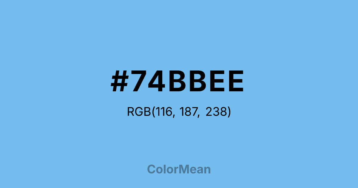 #74BBEE RGB value is (116, 187, 238). The hex color red value is 116, green is 187, and blue is 238. Its HSL format shows a hue of 205°, saturation of 78 percent, and lightness of 69 percent. The CMYK process values are 51 percent, 21 percent, 0 percent, 7 percent.