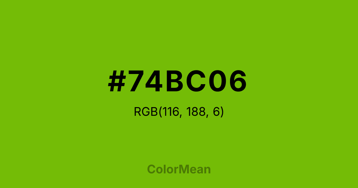 #74BC06 RGB value is (116, 188, 6). The hex color red value is 116, green is 188, and blue is 6. Its HSL format shows a hue of 84°, saturation of 94 percent, and lightness of 38 percent. The CMYK process values are 38 percent, 0 percent, 97 percent, 26 percent.