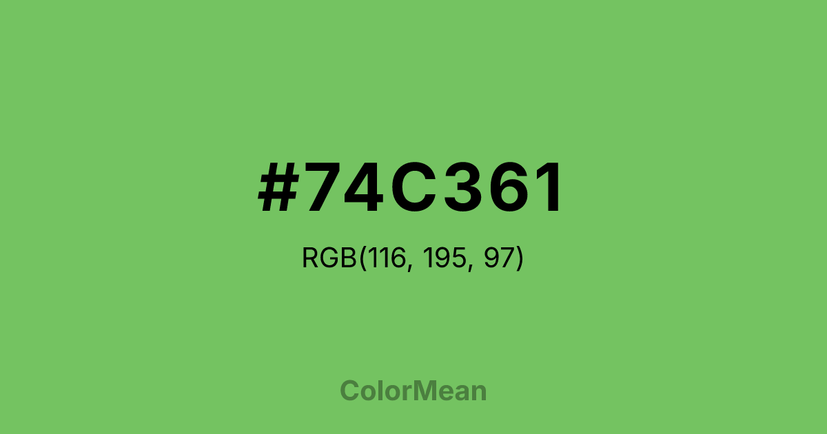 #74C361 RGB value is (116, 195, 97). The hex color red value is 116, green is 195, and blue is 97. Its HSL format shows a hue of 108°, saturation of 45 percent, and lightness of 57 percent. The CMYK process values are 41 percent, 0 percent, 50 percent, 24 percent.