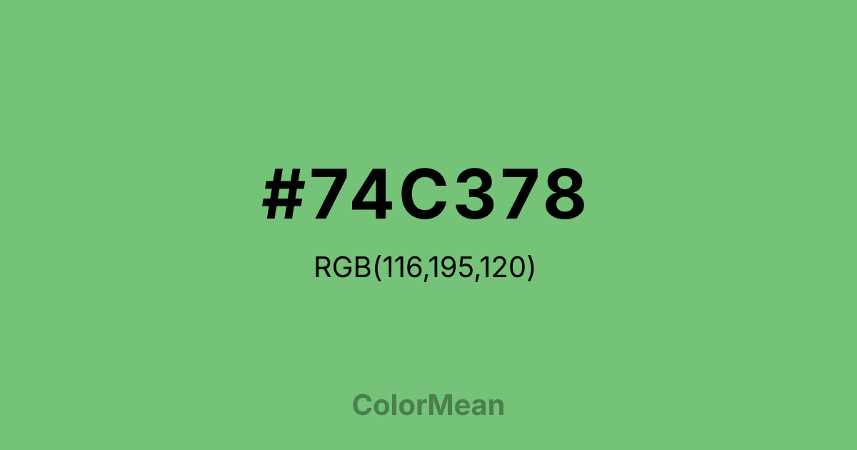 #74C378 RGB value is (116, 195, 120). The hex color red value is 116, green is 195, and blue is 120. Its HSL format shows a hue of 123°, saturation of 40 percent, and lightness of 61 percent. The CMYK process values are 41 percent, 0 percent, 38 percent, 24 percent.