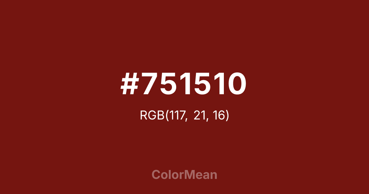 #751510 RGB value is (117, 21, 16). The hex color red value is 117, green is 21, and blue is 16. Its HSL format shows a hue of 3°, saturation of 76 percent, and lightness of 26 percent. The CMYK process values are 0 percent, 82 percent, 86 percent, 54 percent.