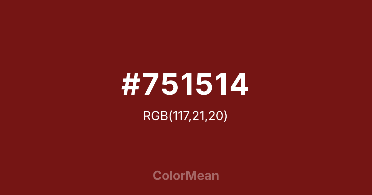 #751514 RGB value is (117, 21, 20). The hex color red value is 117, green is 21, and blue is 20. Its HSL format shows a hue of 1°, saturation of 71 percent, and lightness of 27 percent. The CMYK process values are 0 percent, 82 percent, 83 percent, 54 percent.