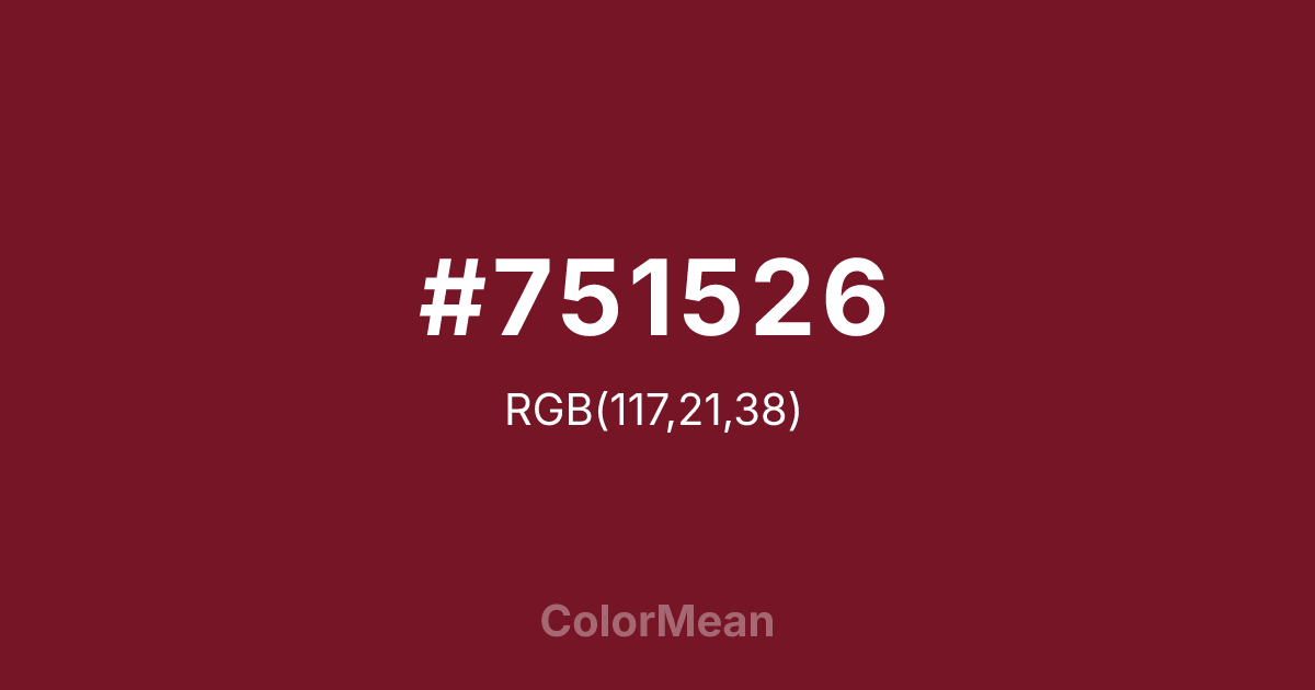 #751526 RGB value is (117, 21, 38). The hex color red value is 117, green is 21, and blue is 38. Its HSL format shows a hue of 349°, saturation of 70 percent, and lightness of 27 percent. The CMYK process values are 0 percent, 82 percent, 68 percent, 54 percent.