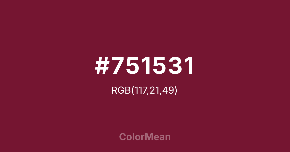 #751531 RGB value is (117, 21, 49). The hex color red value is 117, green is 21, and blue is 49. Its HSL format shows a hue of 343°, saturation of 70 percent, and lightness of 27 percent. The CMYK process values are 0 percent, 82 percent, 58 percent, 54 percent.