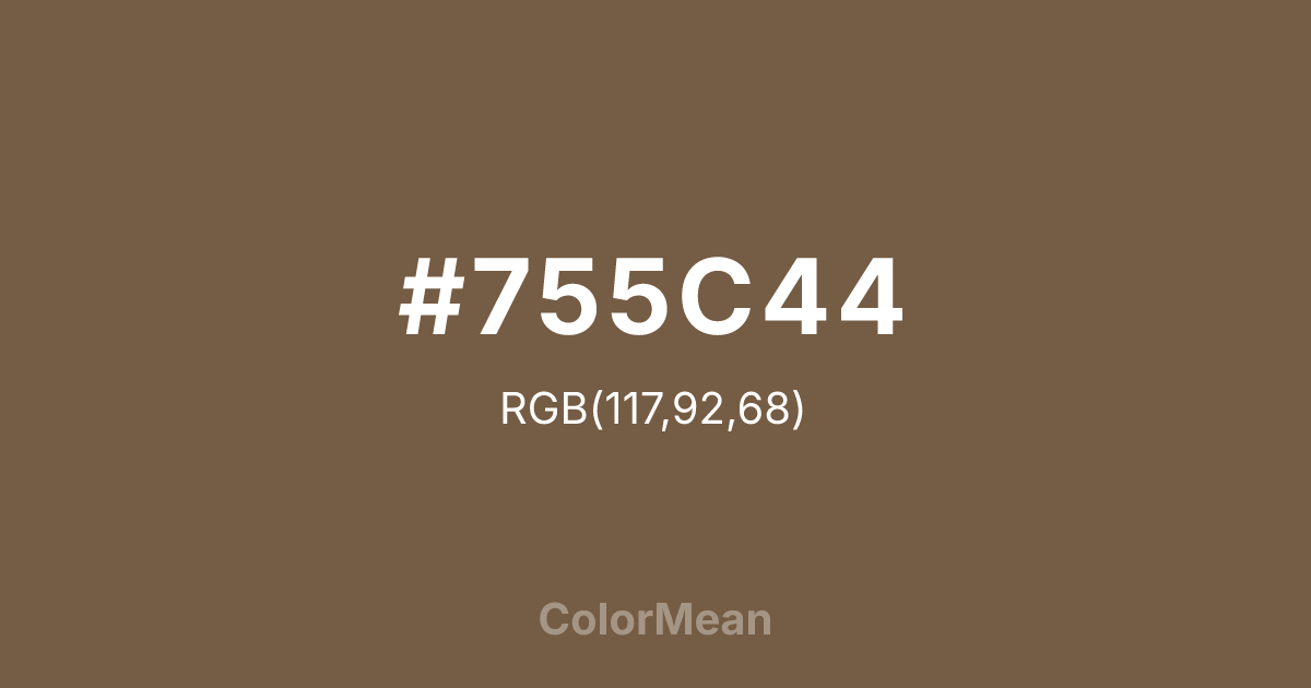 #755C44 RGB value is (117, 92, 68). The hex color red value is 117, green is 92, and blue is 68. Its HSL format shows a hue of 29°, saturation of 26 percent, and lightness of 36 percent. The CMYK process values are 0 percent, 21 percent, 42 percent, 54 percent.