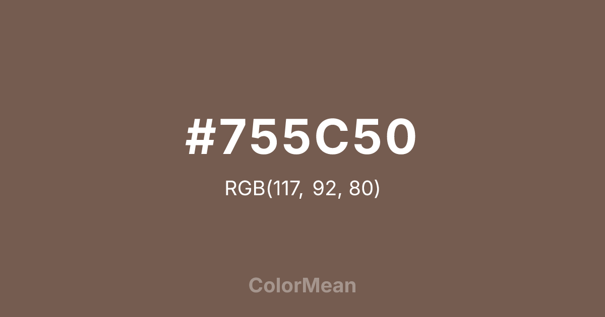 #755C50 RGB value is (117, 92, 80). The hex color red value is 117, green is 92, and blue is 80. Its HSL format shows a hue of 19°, saturation of 19 percent, and lightness of 39 percent. The CMYK process values are 0 percent, 21 percent, 32 percent, 54 percent.