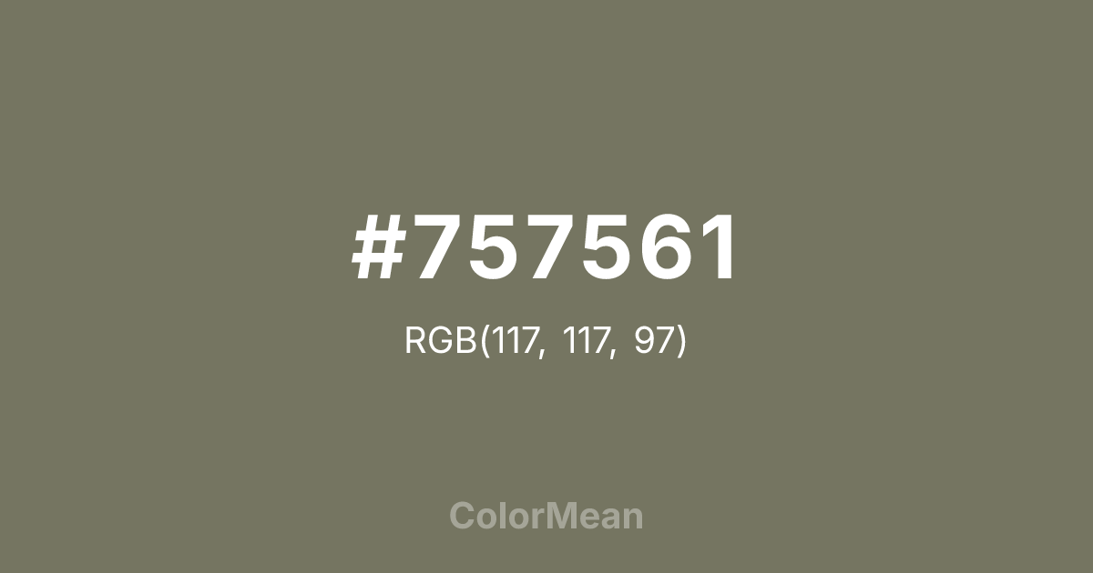 #757561 RGB value is (117, 117, 97). The hex color red value is 117, green is 117, and blue is 97. Its HSL format shows a hue of 60°, saturation of 9 percent, and lightness of 42 percent. The CMYK process values are 0 percent, 0 percent, 17 percent, 54 percent.