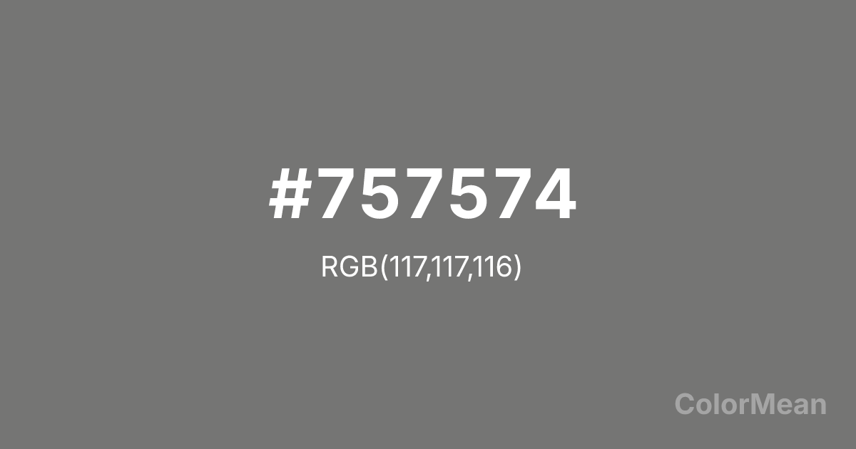 #757574 RGB value is (117, 117, 116). The hex color red value is 117, green is 117, and blue is 116. Its HSL format shows a hue of 60°, saturation of 0 percent, and lightness of 46 percent. The CMYK process values are 0 percent, 0 percent, 1 percent, 54 percent.