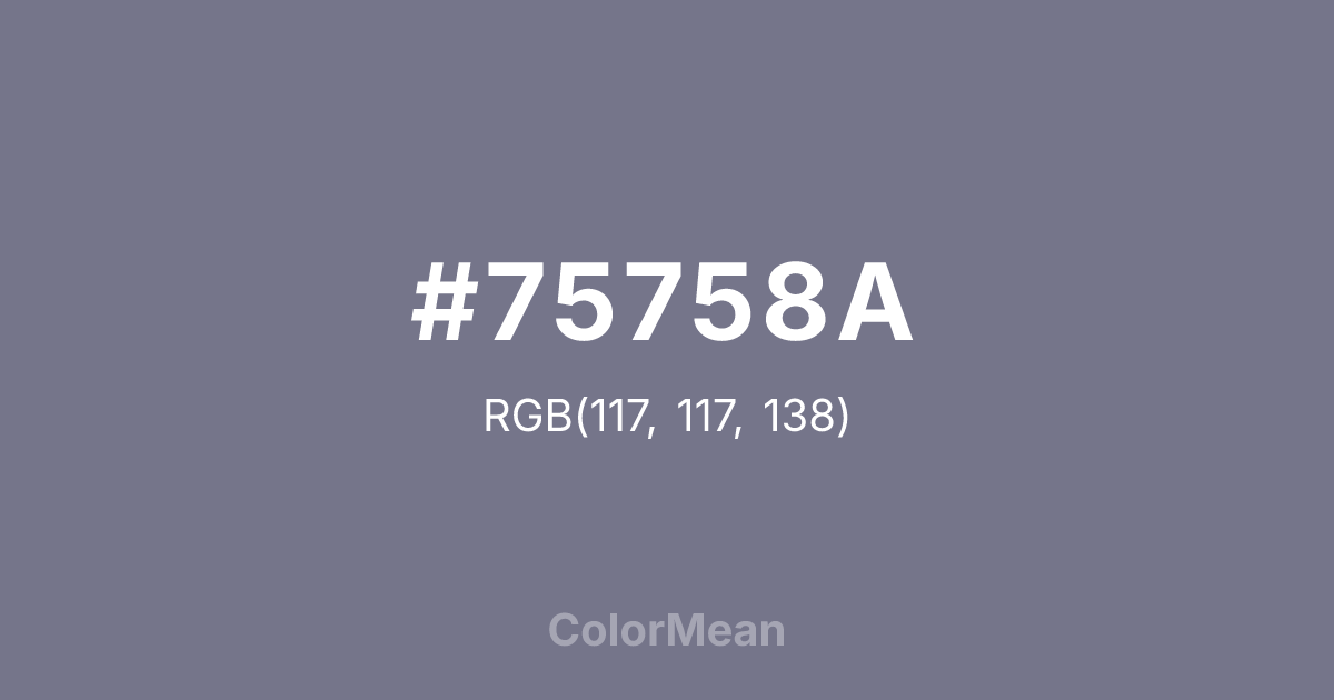 #75758A RGB value is (117, 117, 138). The hex color red value is 117, green is 117, and blue is 138. Its HSL format shows a hue of 240°, saturation of 8 percent, and lightness of 50 percent. The CMYK process values are 15 percent, 15 percent, 0 percent, 46 percent.