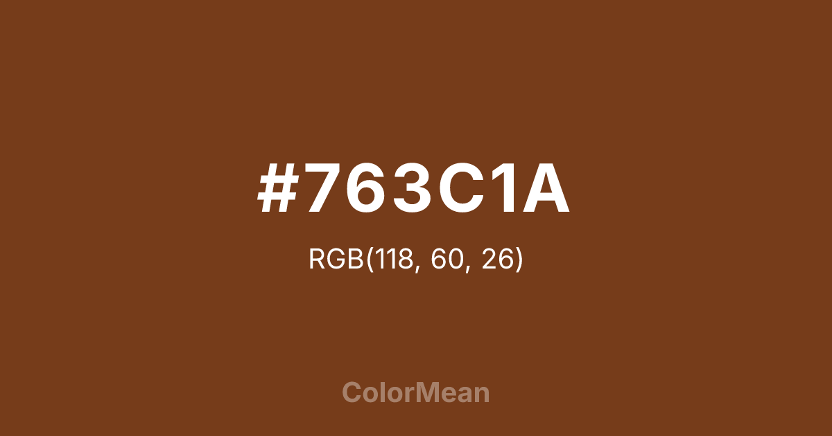 #763C1A RGB value is (118, 60, 26). The hex color red value is 118, green is 60, and blue is 26. Its HSL format shows a hue of 22°, saturation of 64 percent, and lightness of 28 percent. The CMYK process values are 0 percent, 49 percent, 78 percent, 54 percent.