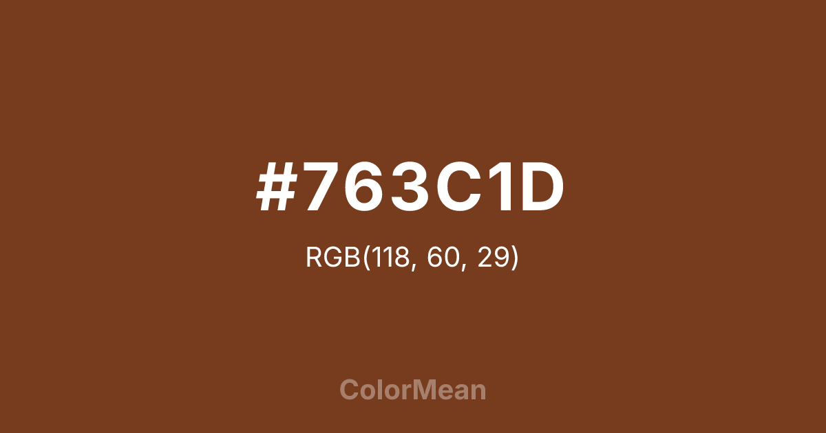 #763C1D RGB value is (118, 60, 29). The hex color red value is 118, green is 60, and blue is 29. Its HSL format shows a hue of 21°, saturation of 61 percent, and lightness of 29 percent. The CMYK process values are 0 percent, 49 percent, 75 percent, 54 percent.