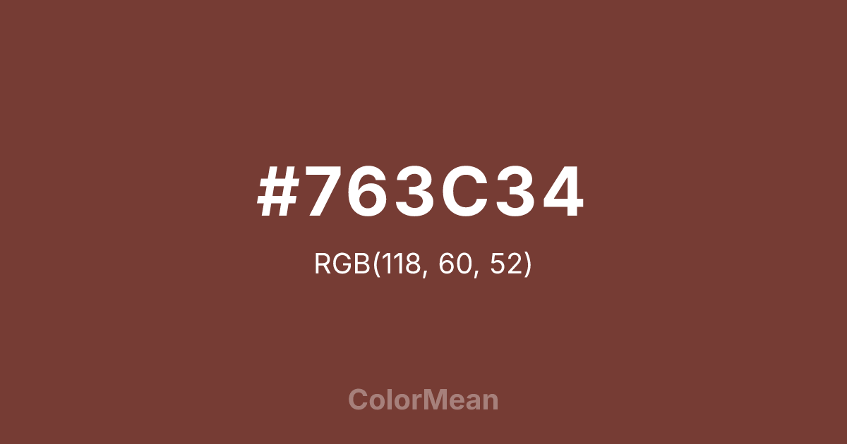 #763C34 RGB value is (118, 60, 52). The hex color red value is 118, green is 60, and blue is 52. Its HSL format shows a hue of 7°, saturation of 39 percent, and lightness of 33 percent. The CMYK process values are 0 percent, 49 percent, 56 percent, 54 percent.