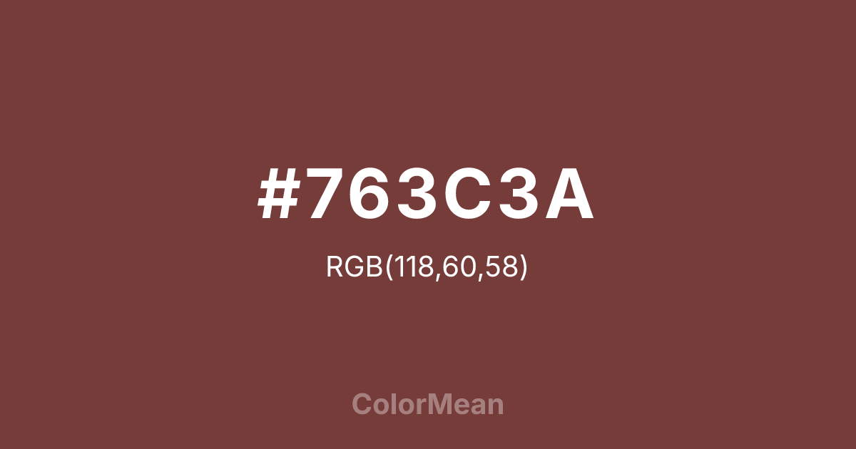 #763C3A RGB value is (118, 60, 58). The hex color red value is 118, green is 60, and blue is 58. Its HSL format shows a hue of 2°, saturation of 34 percent, and lightness of 35 percent. The CMYK process values are 0 percent, 49 percent, 51 percent, 54 percent.