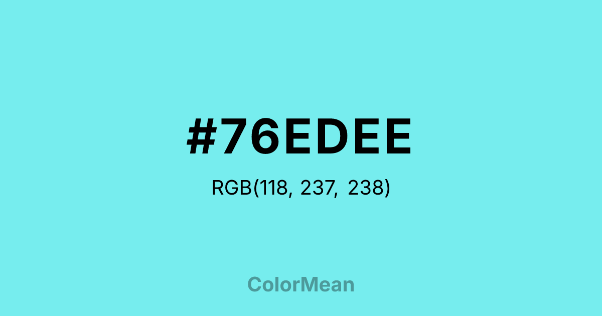 #76EDEE RGB value is (118, 237, 238). The hex color red value is 118, green is 237, and blue is 238. Its HSL format shows a hue of 181°, saturation of 78 percent, and lightness of 70 percent. The CMYK process values are 50 percent, 0 percent, 0 percent, 7 percent.