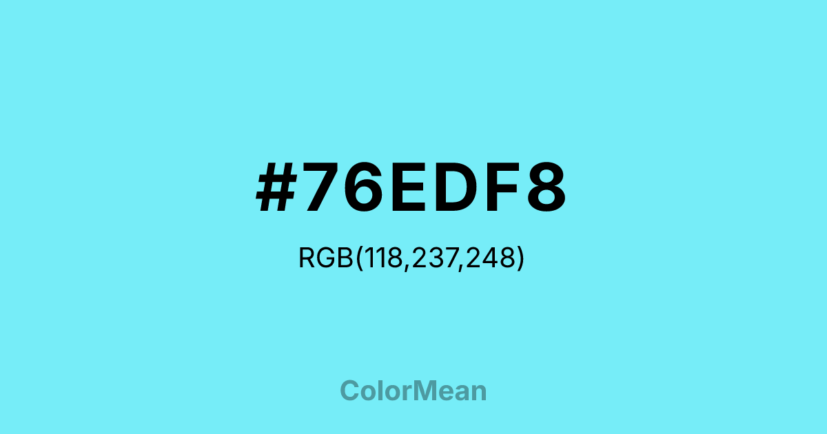 #76EDF8 RGB value is (118, 237, 248). The hex color red value is 118, green is 237, and blue is 248. Its HSL format shows a hue of 185°, saturation of 90 percent, and lightness of 72 percent. The CMYK process values are 52 percent, 4 percent, 0 percent, 3 percent.