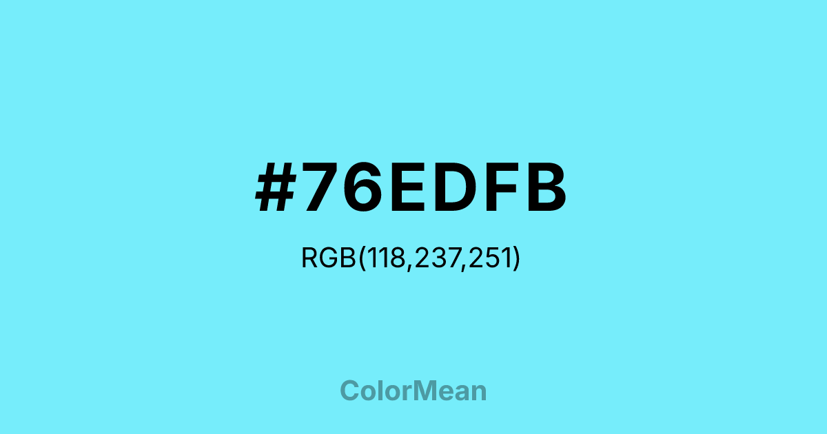 #76EDFB RGB value is (118, 237, 251). The hex color red value is 118, green is 237, and blue is 251. Its HSL format shows a hue of 186°, saturation of 94 percent, and lightness of 72 percent. The CMYK process values are 53 percent, 6 percent, 0 percent, 2 percent.