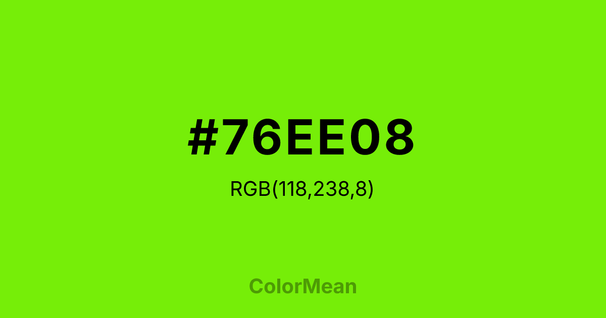 #76EE08 RGB value is (118, 238, 8). The hex color red value is 118, green is 238, and blue is 8. Its HSL format shows a hue of 91°, saturation of 93 percent, and lightness of 48 percent. The CMYK process values are 50 percent, 0 percent, 97 percent, 7 percent.