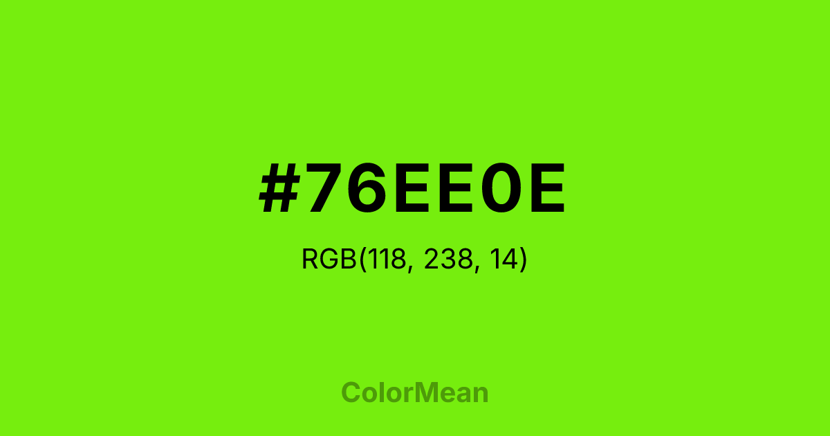#76EE0E RGB value is (118, 238, 14). The hex color red value is 118, green is 238, and blue is 14. Its HSL format shows a hue of 92°, saturation of 89 percent, and lightness of 49 percent. The CMYK process values are 50 percent, 0 percent, 94 percent, 7 percent.