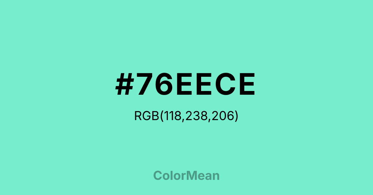 #76EECE RGB value is (118, 238, 206). The hex color red value is 118, green is 238, and blue is 206. Its HSL format shows a hue of 164°, saturation of 78 percent, and lightness of 70 percent. The CMYK process values are 50 percent, 0 percent, 13 percent, 7 percent.