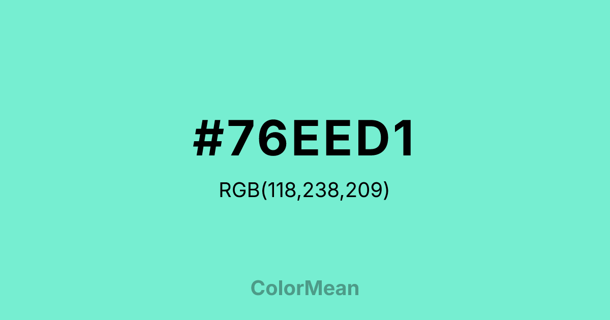 #76EED1 RGB value is (118, 238, 209). The hex color red value is 118, green is 238, and blue is 209. Its HSL format shows a hue of 166°, saturation of 78 percent, and lightness of 70 percent. The CMYK process values are 50 percent, 0 percent, 12 percent, 7 percent.