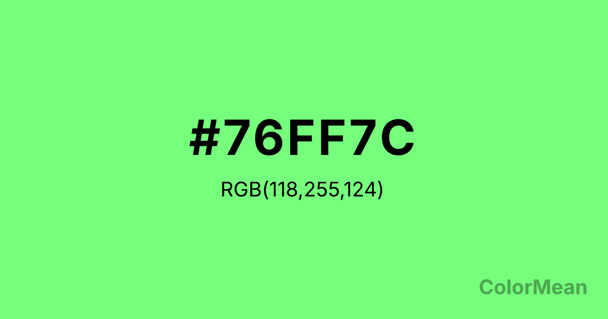 #76FF7C RGB value is (118, 255, 124). The hex color red value is 118, green is 255, and blue is 124. Its HSL format shows a hue of 123°, saturation of 100 percent, and lightness of 73 percent. The CMYK process values are 54 percent, 0 percent, 51 percent, 0 percent.