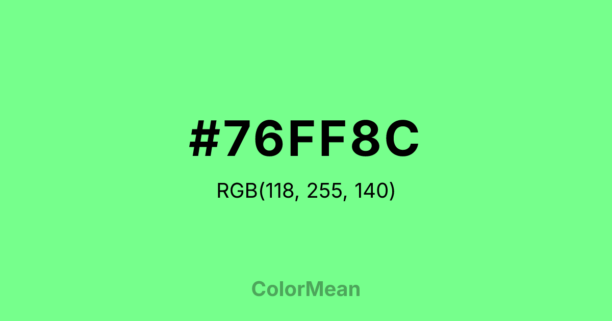 #76FF8C RGB value is (118, 255, 140). The hex color red value is 118, green is 255, and blue is 140. Its HSL format shows a hue of 130°, saturation of 100 percent, and lightness of 73 percent. The CMYK process values are 54 percent, 0 percent, 45 percent, 0 percent.