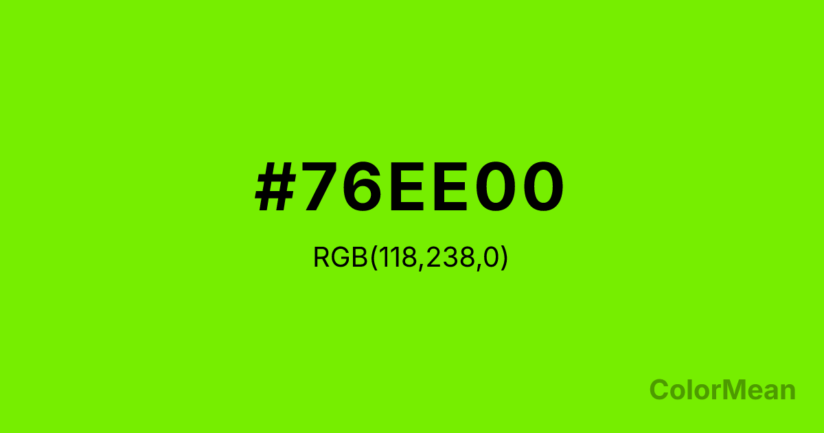 Chartreuse2 (#76EE00) RGB value is (118, 238, 0). The hex color red value is 118, green is 238, and blue is 0. Its HSL format shows a hue of 90°, saturation of 100 percent, and lightness of 47 percent. The CMYK process values are 50 percent, 0 percent, 100 percent, 7 percent.