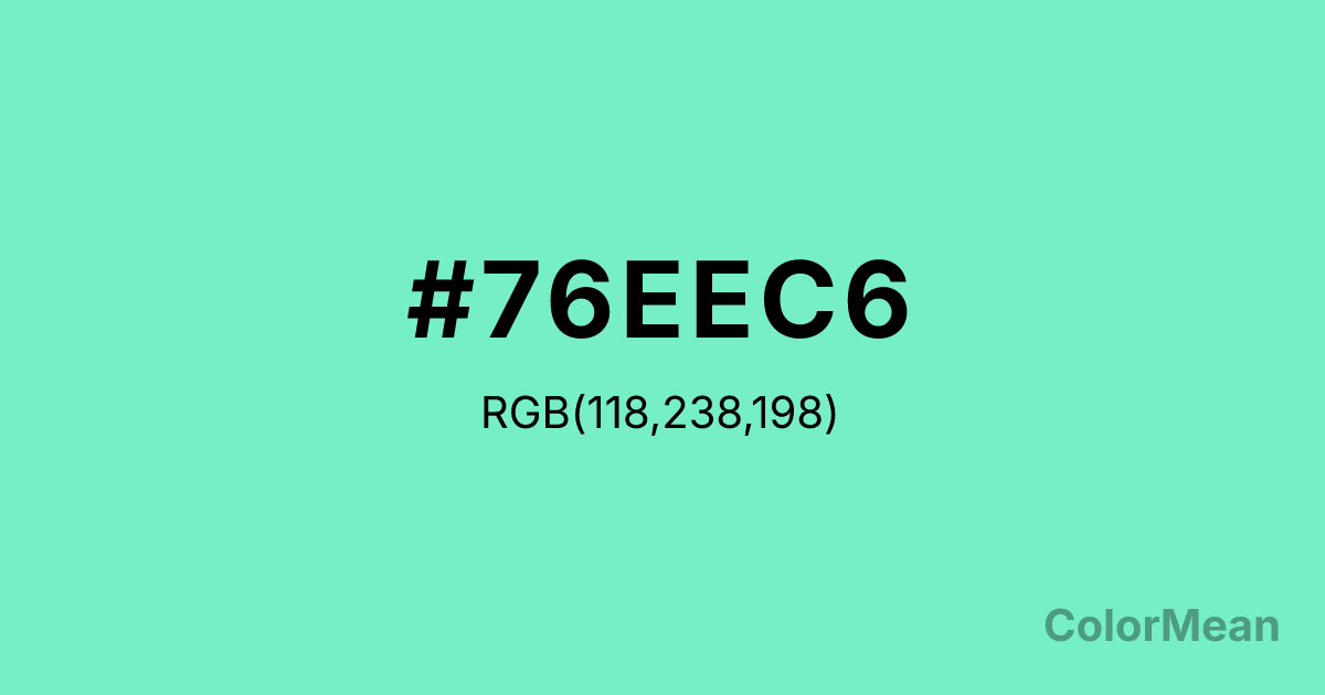 Aquamarine2 (#76EEC6) RGB value is (118, 238, 198). The hex color red value is 118, green is 238, and blue is 198. Its HSL format shows a hue of 160°, saturation of 78 percent, and lightness of 70 percent. The CMYK process values are 50 percent, 0 percent, 17 percent, 7 percent.