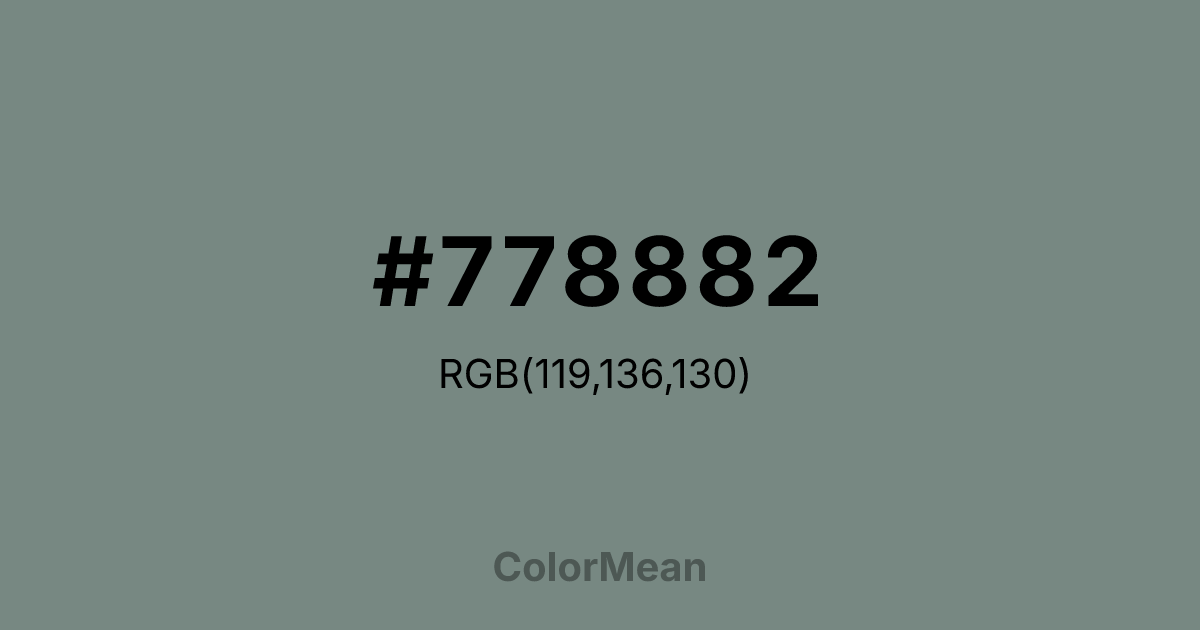 #778882 RGB value is (119, 136, 130). The hex color red value is 119, green is 136, and blue is 130. Its HSL format shows a hue of 159°, saturation of 7 percent, and lightness of 50 percent. The CMYK process values are 12 percent, 0 percent, 4 percent, 47 percent.