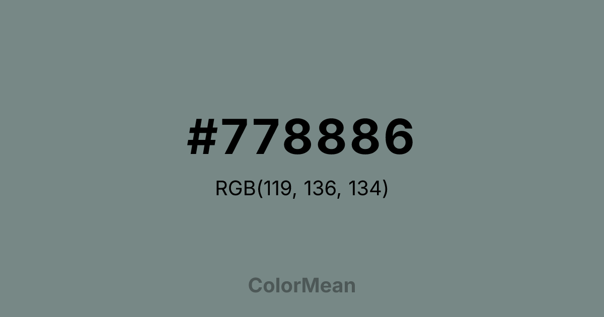 #778886 RGB value is (119, 136, 134). The hex color red value is 119, green is 136, and blue is 134. Its HSL format shows a hue of 173°, saturation of 7 percent, and lightness of 50 percent. The CMYK process values are 12 percent, 0 percent, 1 percent, 47 percent.