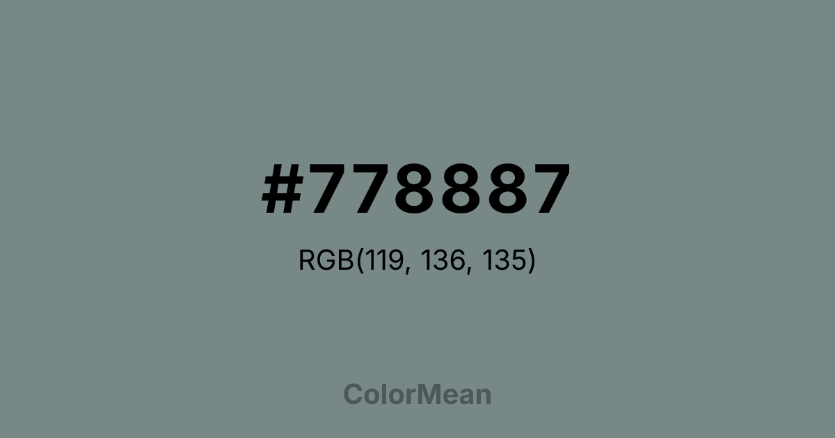 Color #778887 is a medium-gray shade with subtle blue undertones, a muted tone in the gray spectrum. Color #778887 psychologically promotes calm, neutrality, and analytical thinking, supporting composed decision-making and focus. Culturally, color #778887 appears in interiors, fashion, and design to convey sophistication, balance, and understated elegance. Spiritually, #778887 resonates with the third eye chakra, enhancing mental clarity, reflective thinking, and intuitive awareness. Feng Shui uses #778887 to encourage stability, neutral energy, and calm flow, ideal for study areas or offices.