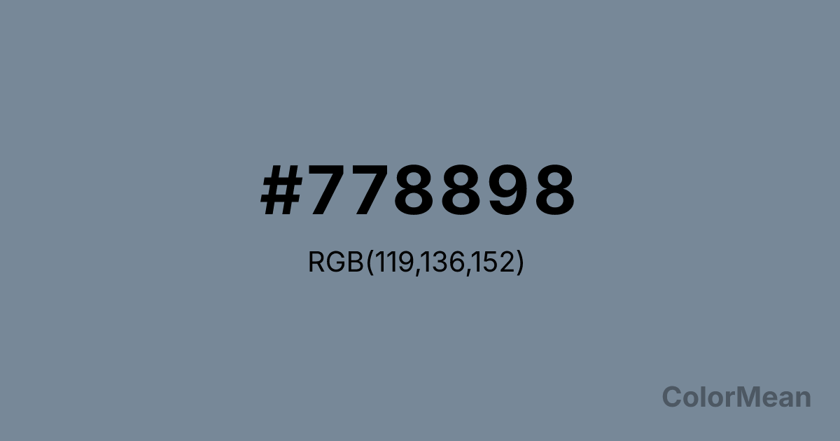 #778898 RGB value is (119, 136, 152). The hex color red value is 119, green is 136, and blue is 152. Its HSL format shows a hue of 209°, saturation of 14 percent, and lightness of 53 percent. The CMYK process values are 22 percent, 11 percent, 0 percent, 40 percent.