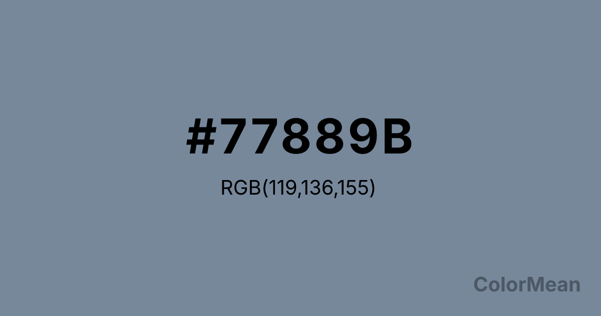 #77889B RGB value is (119, 136, 155). The hex color red value is 119, green is 136, and blue is 155. Its HSL format shows a hue of 212°, saturation of 15 percent, and lightness of 54 percent. The CMYK process values are 23 percent, 12 percent, 0 percent, 39 percent.