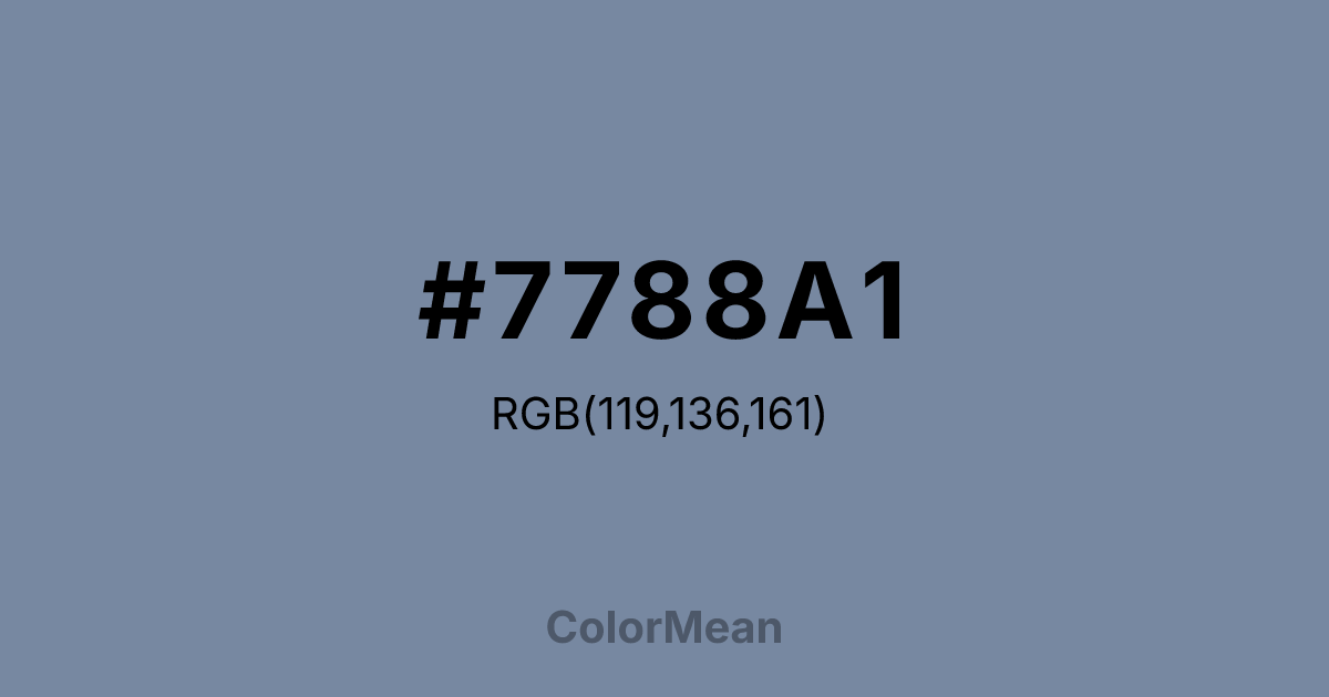 #7788A1 RGB value is (119, 136, 161). The hex color red value is 119, green is 136, and blue is 161. Its HSL format shows a hue of 216°, saturation of 18 percent, and lightness of 55 percent. The CMYK process values are 26 percent, 16 percent, 0 percent, 37 percent.