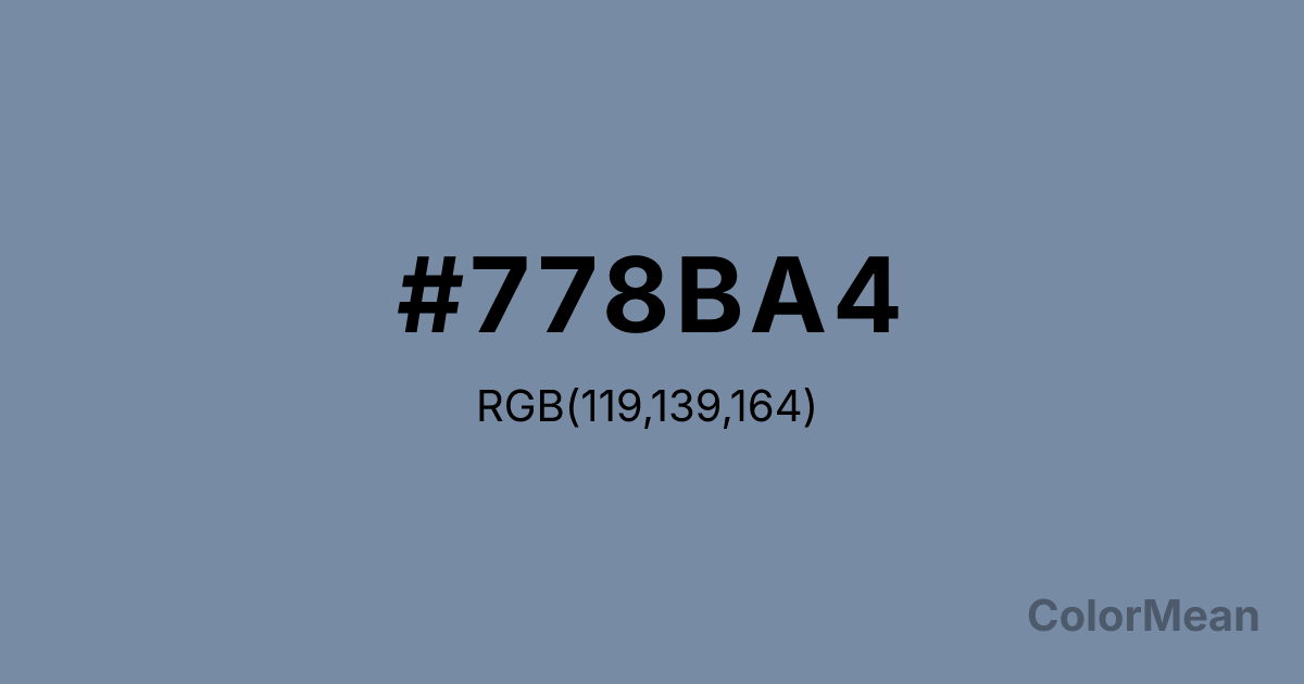 #778BA4 RGB value is (119, 139, 164). The hex color red value is 119, green is 139, and blue is 164. Its HSL format shows a hue of 213°, saturation of 20 percent, and lightness of 55 percent. The CMYK process values are 27 percent, 15 percent, 0 percent, 36 percent.