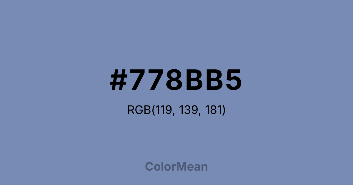#778BB5 RGB value is (119, 139, 181). The hex color red value is 119, green is 139, and blue is 181. Its HSL format shows a hue of 221°, saturation of 30 percent, and lightness of 59 percent. The CMYK process values are 34 percent, 23 percent, 0 percent, 29 percent.