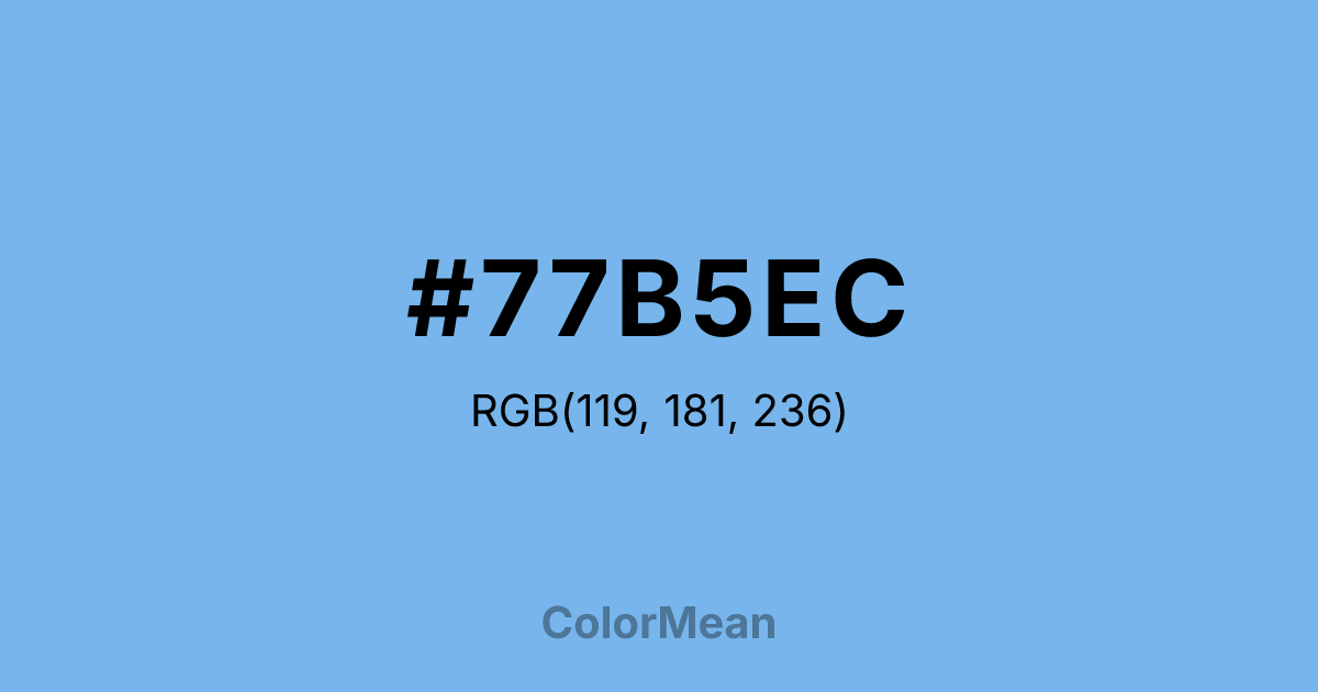 #77B5EC RGB value is (119, 181, 236). The hex color red value is 119, green is 181, and blue is 236. Its HSL format shows a hue of 208°, saturation of 75 percent, and lightness of 70 percent. The CMYK process values are 50 percent, 23 percent, 0 percent, 7 percent.