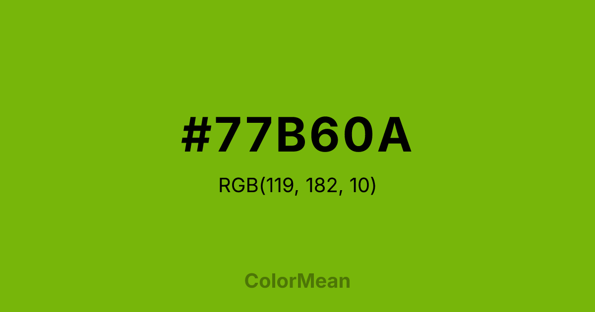 #77B60A RGB value is (119, 182, 10). The hex color red value is 119, green is 182, and blue is 10. Its HSL format shows a hue of 82°, saturation of 90 percent, and lightness of 38 percent. The CMYK process values are 35 percent, 0 percent, 95 percent, 29 percent.