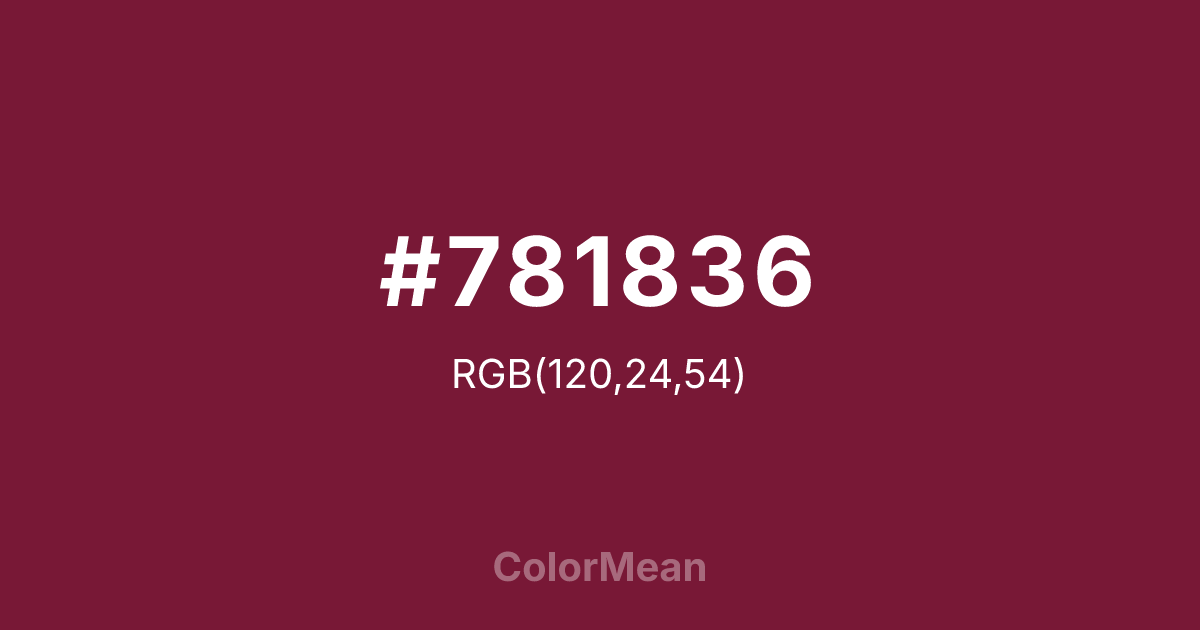 #781836 RGB value is (120, 24, 54). The hex color red value is 120, green is 24, and blue is 54. Its HSL format shows a hue of 341°, saturation of 67 percent, and lightness of 28 percent. The CMYK process values are 0 percent, 80 percent, 55 percent, 53 percent.