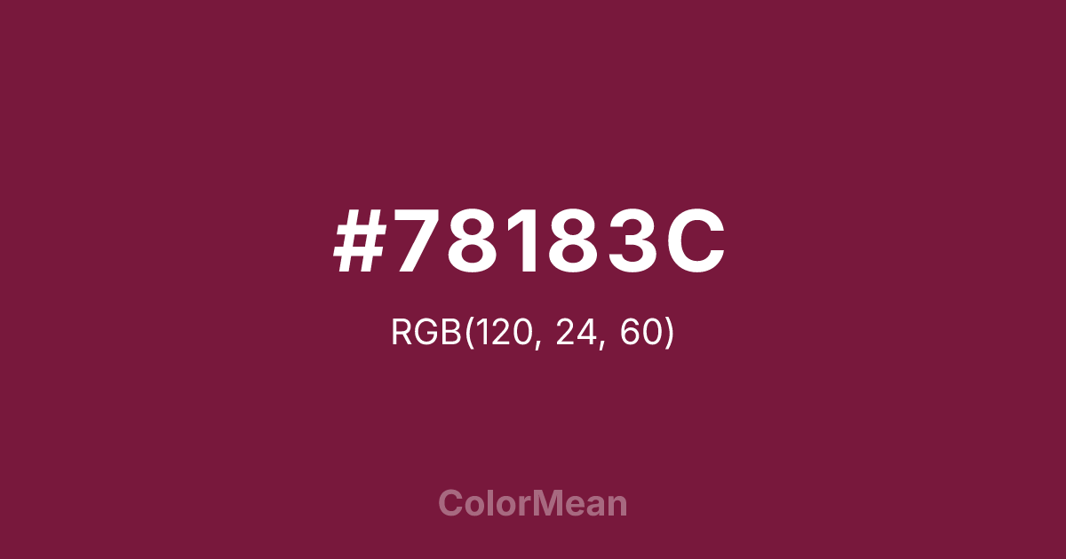 #78183C RGB value is (120, 24, 60). The hex color red value is 120, green is 24, and blue is 60. Its HSL format shows a hue of 338°, saturation of 67 percent, and lightness of 28 percent. The CMYK process values are 0 percent, 80 percent, 50 percent, 53 percent.