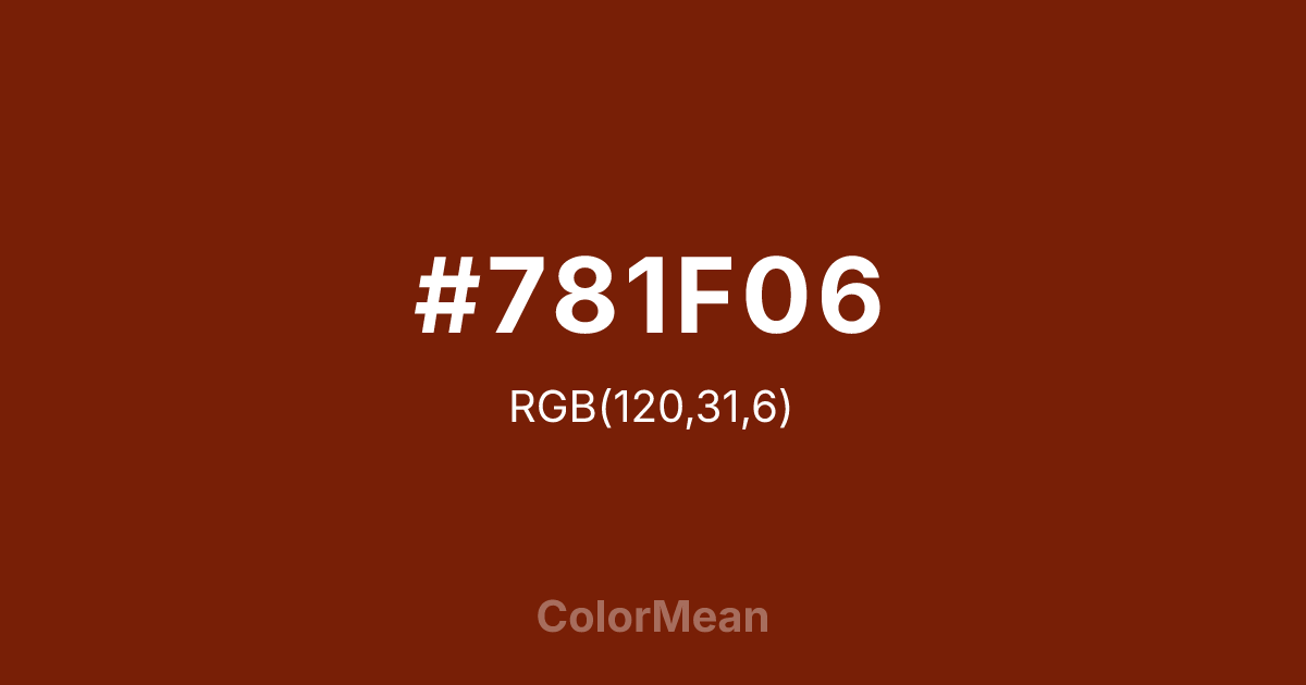 #781F06 RGB value is (120, 31, 6). The hex color red value is 120, green is 31, and blue is 6. Its HSL format shows a hue of 13°, saturation of 90 percent, and lightness of 25 percent. The CMYK process values are 0 percent, 74 percent, 95 percent, 53 percent.