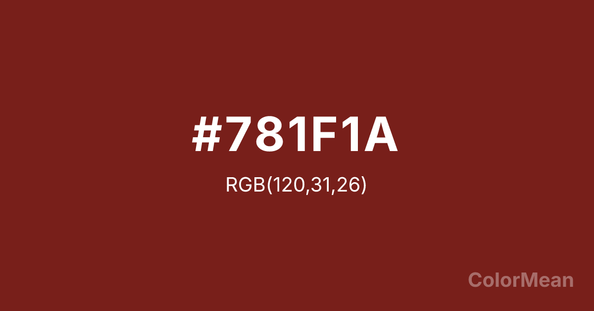 #781F1A RGB value is (120, 31, 26). The hex color red value is 120, green is 31, and blue is 26. Its HSL format shows a hue of 3°, saturation of 64 percent, and lightness of 29 percent. The CMYK process values are 0 percent, 74 percent, 78 percent, 53 percent.