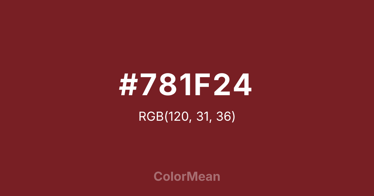 #781F24 RGB value is (120, 31, 36). The hex color red value is 120, green is 31, and blue is 36. Its HSL format shows a hue of 357°, saturation of 59 percent, and lightness of 30 percent. The CMYK process values are 0 percent, 74 percent, 70 percent, 53 percent.