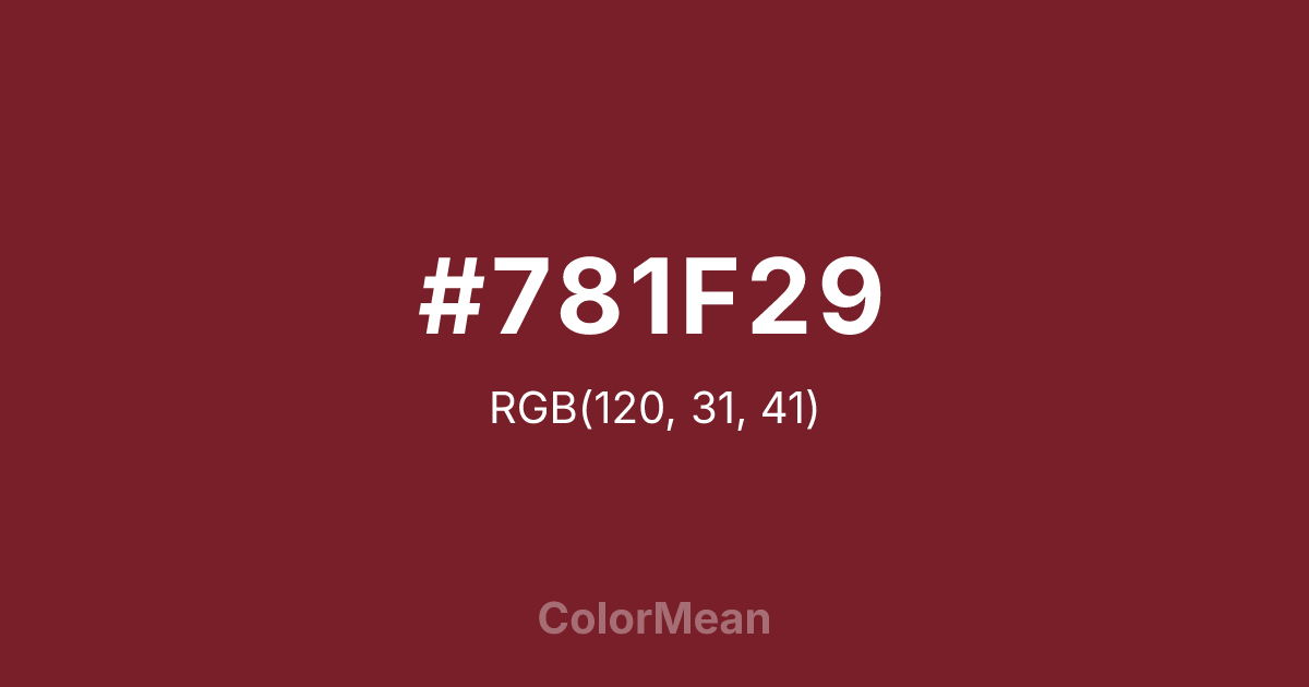 #781F29 RGB value is (120, 31, 41). The hex color red value is 120, green is 31, and blue is 41. Its HSL format shows a hue of 353°, saturation of 59 percent, and lightness of 30 percent. The CMYK process values are 0 percent, 74 percent, 66 percent, 53 percent.
