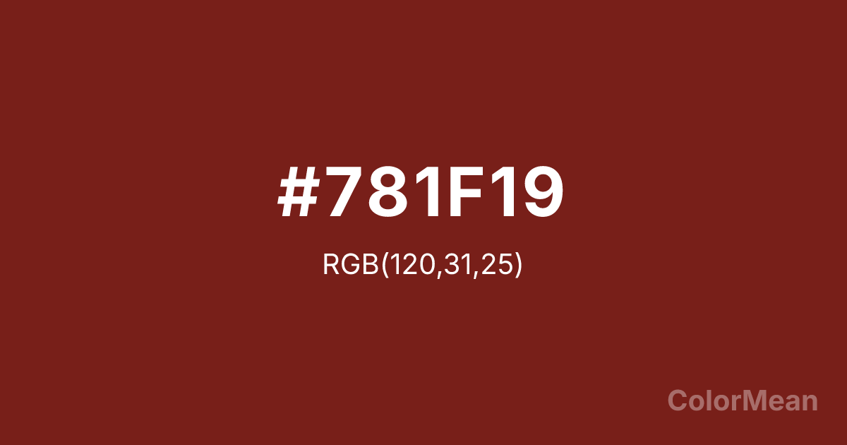 Brown Red (#781F19) RGB value is (120, 31, 25). The hex color red value is 120, green is 31, and blue is 25. Its HSL format shows a hue of 4°, saturation of 66 percent, and lightness of 28 percent. The CMYK process values are 0 percent, 74 percent, 79 percent, 53 percent.