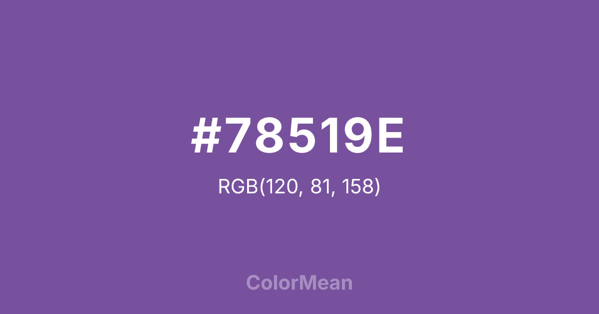 #78519E RGB value is (120, 81, 158). The hex color red value is 120, green is 81, and blue is 158. Its HSL format shows a hue of 270°, saturation of 32 percent, and lightness of 47 percent. The CMYK process values are 24 percent, 49 percent, 0 percent, 38 percent.