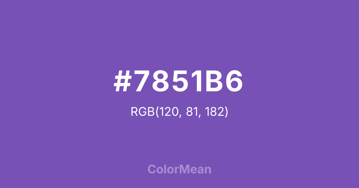#7851B6 RGB value is (120, 81, 182). The hex color red value is 120, green is 81, and blue is 182. Its HSL format shows a hue of 263°, saturation of 41 percent, and lightness of 52 percent. The CMYK process values are 34 percent, 55 percent, 0 percent, 29 percent.
