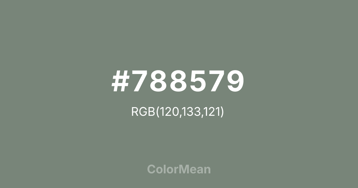 #788579 RGB value is (120, 133, 121). The hex color red value is 120, green is 133, and blue is 121. Its HSL format shows a hue of 125°, saturation of 5 percent, and lightness of 50 percent. The CMYK process values are 10 percent, 0 percent, 9 percent, 48 percent.