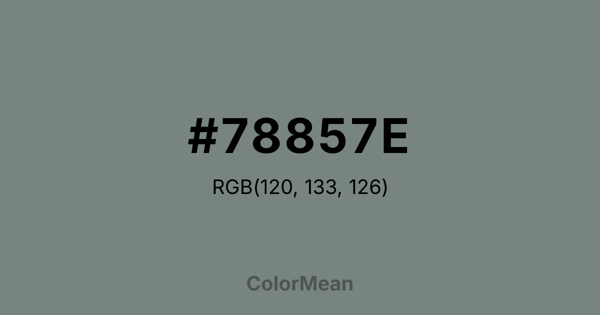 #78857E RGB value is (120, 133, 126). The hex color red value is 120, green is 133, and blue is 126. Its HSL format shows a hue of 148°, saturation of 5 percent, and lightness of 50 percent. The CMYK process values are 10 percent, 0 percent, 5 percent, 48 percent.