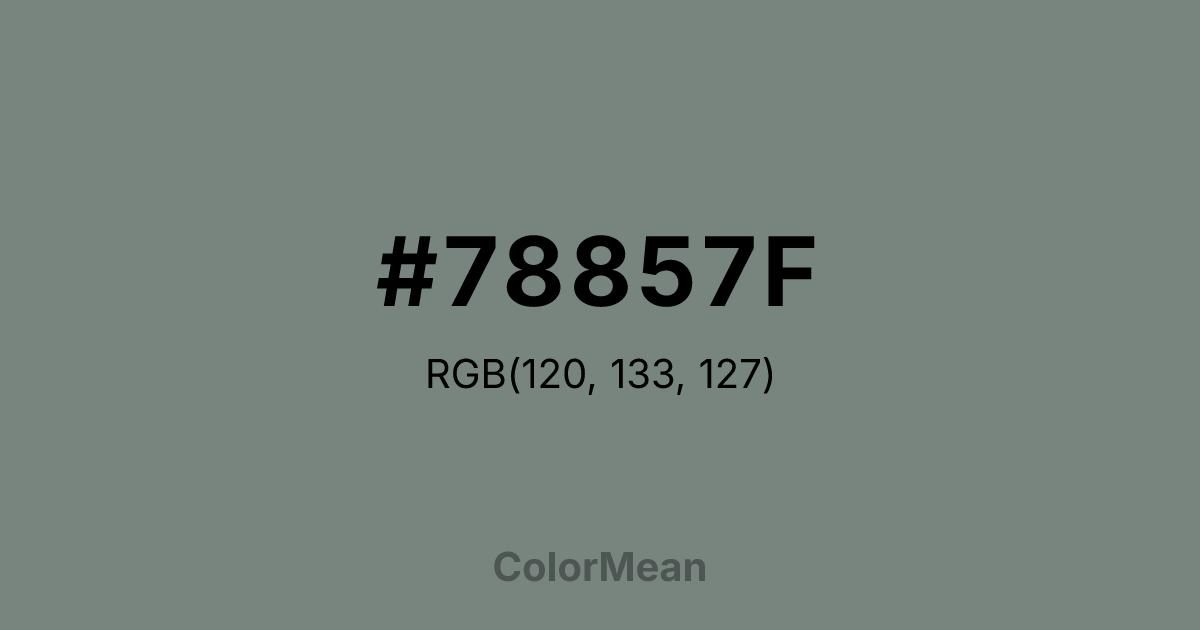 #78857F RGB value is (120, 133, 127). The hex color red value is 120, green is 133, and blue is 127. Its HSL format shows a hue of 152°, saturation of 5 percent, and lightness of 50 percent. The CMYK process values are 10 percent, 0 percent, 5 percent, 48 percent.